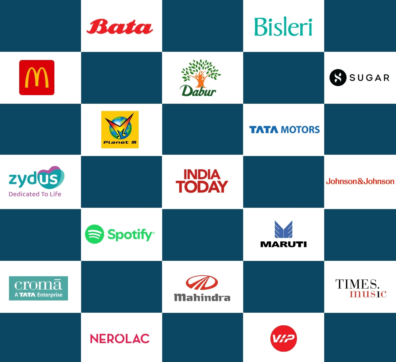 Bata, Bisleri, Sugar Cosmetics, Dabur, Maruti, Tata Motors, McDonalds, Mahindra & Mahindra, Nerolac, GM Switches, VIP Luggage, Croma, Spotify, Johnson & Johnson, Novartis, Zydus, Times Music, Planet M, Economic Times, India Today